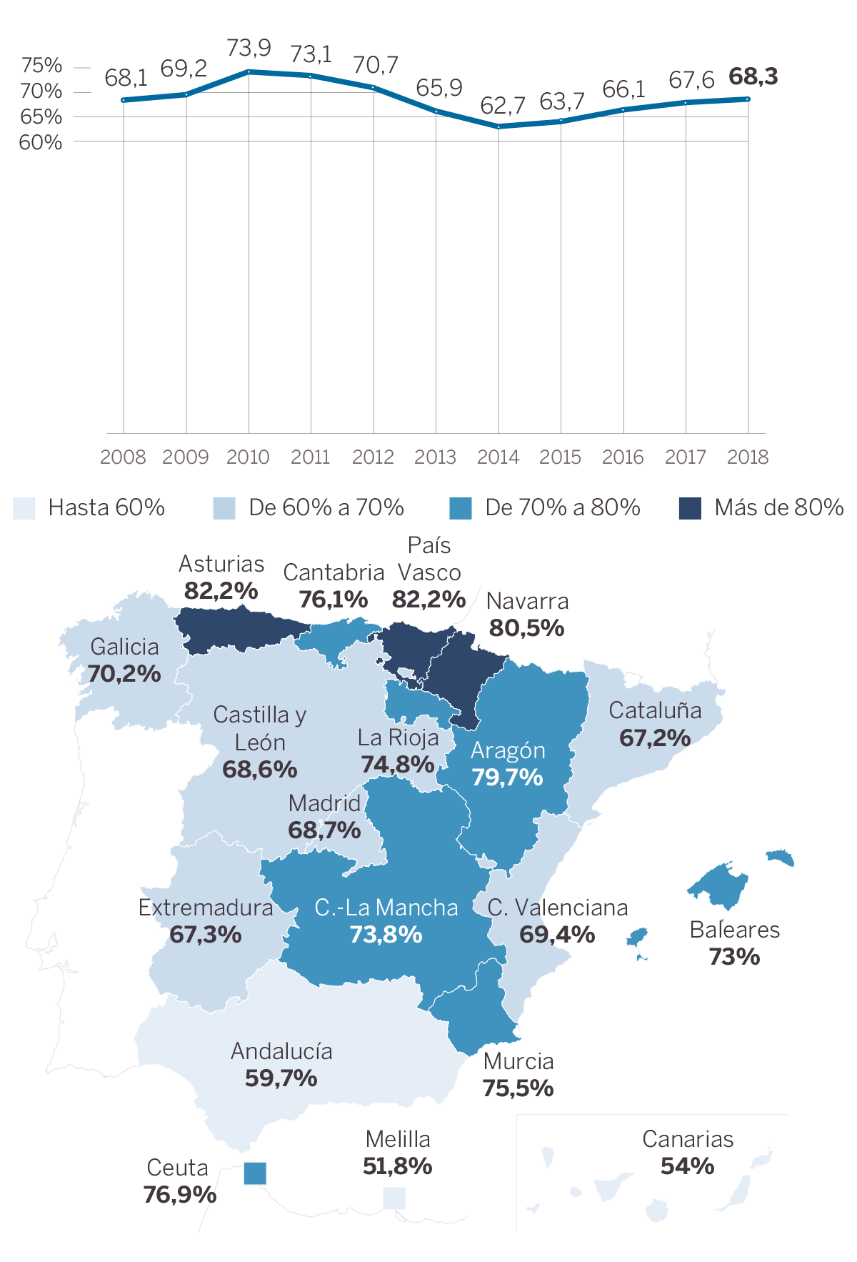 También por encima del 80% de satisfacción están los ciudadanos vascos y navarros. Por debajo del 60% están los andaluces. Precisamente el País Vasco, Asturias y Navarra son, por este orden, las comunidades que más presupuestaron gastar en sanidad por persona en 2018, según los cálculos de la Federación de Asociaciones para la Defensa de la Sanidad Pública. Andalucía es la última en esta lista, y Canarias, la quinta por la cola.