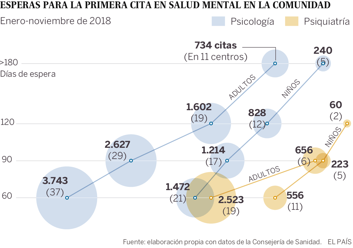 En Madrid, el drama de las listas de espera en la sanidad pública tiene su corazón en Coslada y Chamartín. Entre las dos poblaciones se reparten un centenar de citas de adultos y jóvenes —81 y 38, respectivamente— que entre enero y noviembre de 2018 esperaron más de 320 días de media para que un psicólogo les atendiera por primera vez. La angustia de esas familias sometidas a la tortura del paso del tiempo sin obtener ayuda se reprodujo con distinta intensidad por toda la región: de media, los adultos residentes en la Comunidad tuvieron que esperar cuatro meses para ser atendidos por un psicólogo (121 días), y los niños todo un trimestre (92), según una respuesta parlamentaria del Gobierno a la que ha tenido acceso EL PAÍS. En medio, posibles depresiones, ataques de ansiedad o trastornos esquizoides que se enquistaron sin que nadie los tratara con terapia.