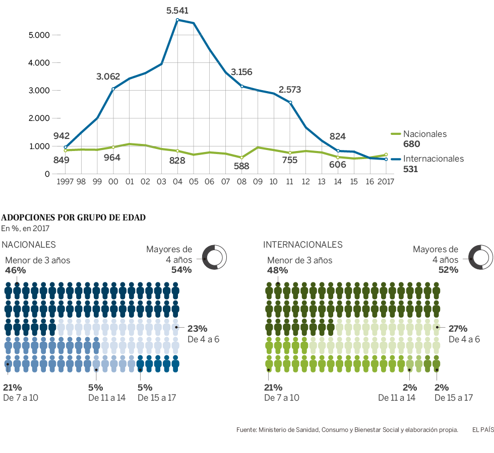 El número de adopciones nacionales (680) supera por primera vez en 20 años al de las internacionales (531)