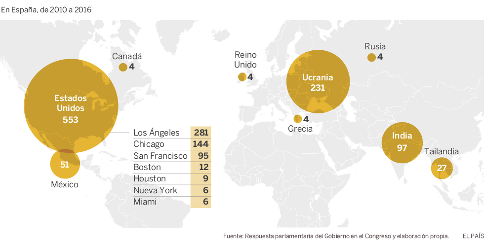 Casi mil niños han sido reconocidos como hijos por gestación subrogada en España entre 2010 y 2016, según los datos aportados en una respuesta parlamentaria. Estos niños proceden de 12 países donde esta práctica está permitida y a los que acuden parejas españolas. Entre ellos destacan Estados Unidos y Ucrania, de donde proceden el 78% de los niños nacidos por este método que supone que una mujer gesta un hijo cuya maternidad y paternidad cede a otras personas.
