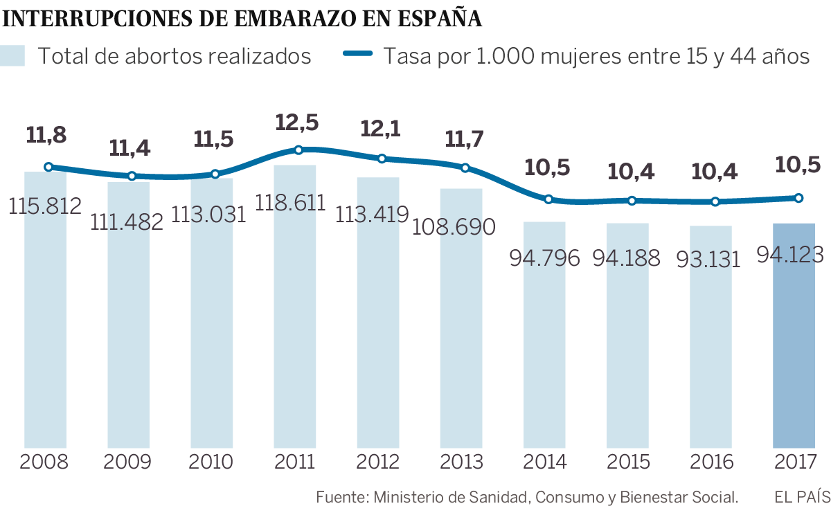 La normativa actual sobre interrupciones voluntarias del embarazo, aprobada en 2010, no ha supuesto un aumento del número de abortos. De hecho, se ha producido una reducción paulatina, según la evolución de los datos que ofrece el Ministerio de Sanidad. Desde entonces se ha pasado de una tasa de 11,78 abortos por cada 1.000 mujeres a una de 10,51. En números absolutos, los 113.000 abortos de 2010 pasaron a 118.000 en 2011. Pero a partir de ese año se han registrado caídas anuales hasta llegar a las 93.131 intervenciones de 2016, o las 94.123 registradas en 2017.