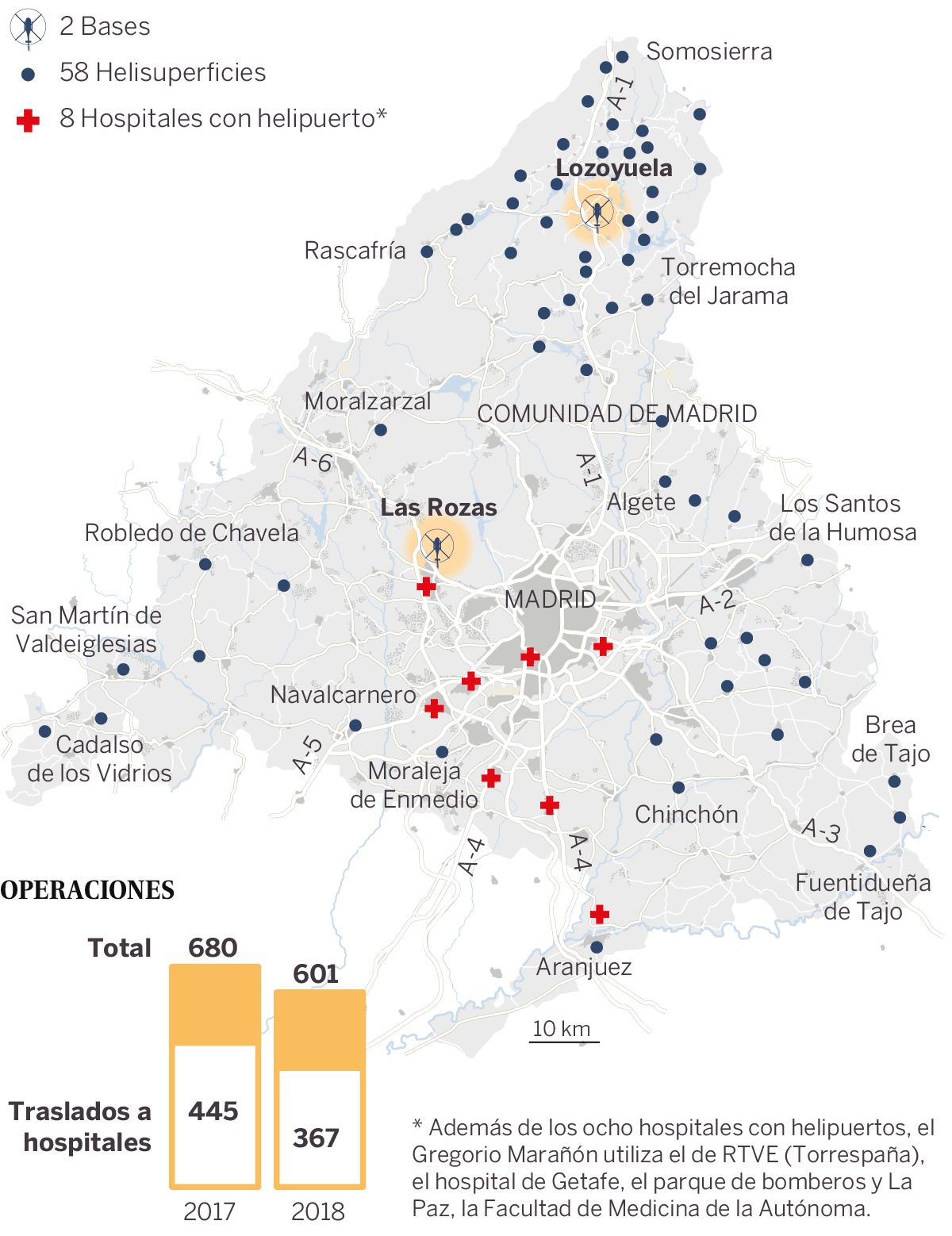 Para responder a este tipo de situaciones, el Servicio de Urgencia Médica de Madrid (Summa 112) dispone de dos helicópteros, situados en las bases Lozoyuela y Las Rozas, que pueden acudir a cualquier emergencia sanitaria de la región en menos de 20 minutos. El primero es más rápido y ligero para llegar a carreteras y zonas urbanas, mientras que el segundo tiene tren de esquí para poder acceder más fácilmente a lugares montañosos.