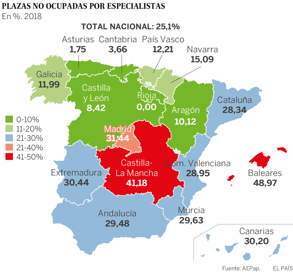 La Asociación Española de Pediatría en Atención Primaria advierte de que en España 1.600 plazas pediátricas no están ocupadas por especialistas, el 25% de las 6.402 existentes. Esta situación deja, según sus estimaciones, a casi 1.600.000 niños sin la atención especializada que recomienda la Organización Mundial de la Salud (OMS). En la última década la población menor de 14 años ha aumentado en mayor proporción que el número de pediatras. En 2008 había 5.962.884 niños y 6.215 pediatras. Diez años después hay 276.000 menores y 291 especialistas más: siete niños más por pediatra.