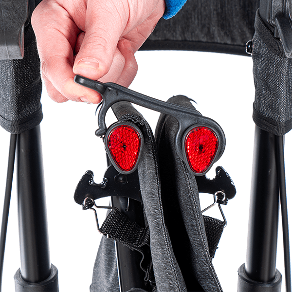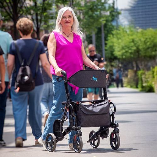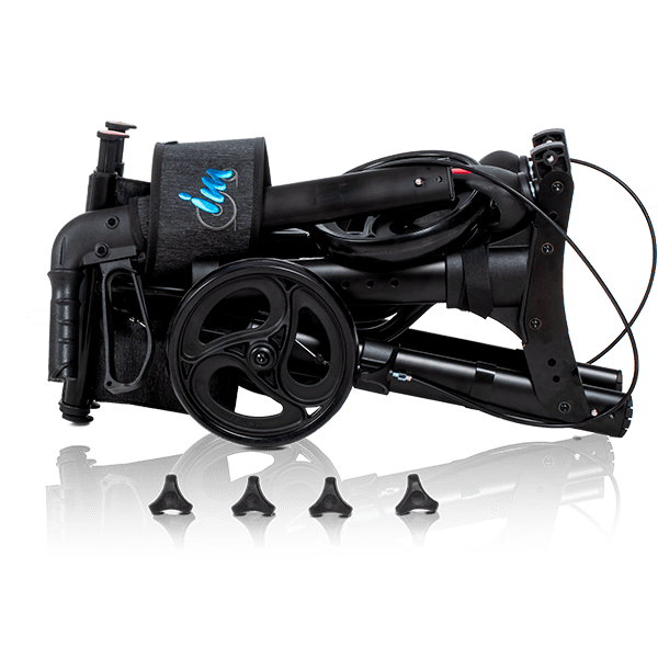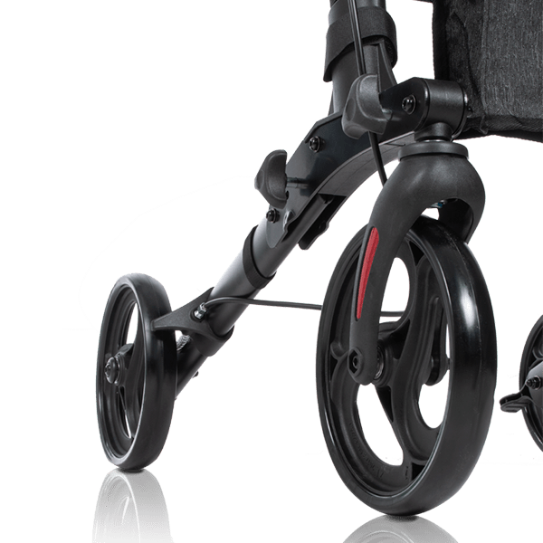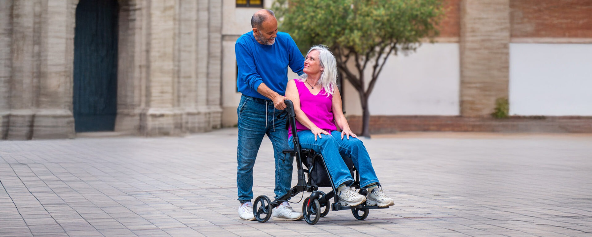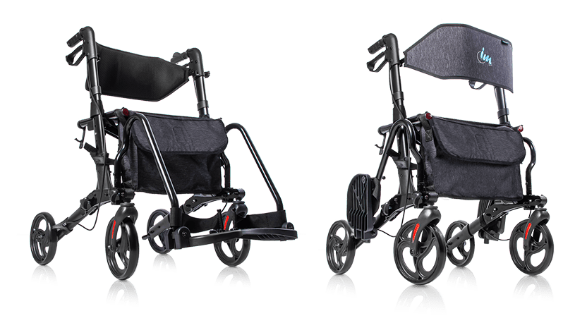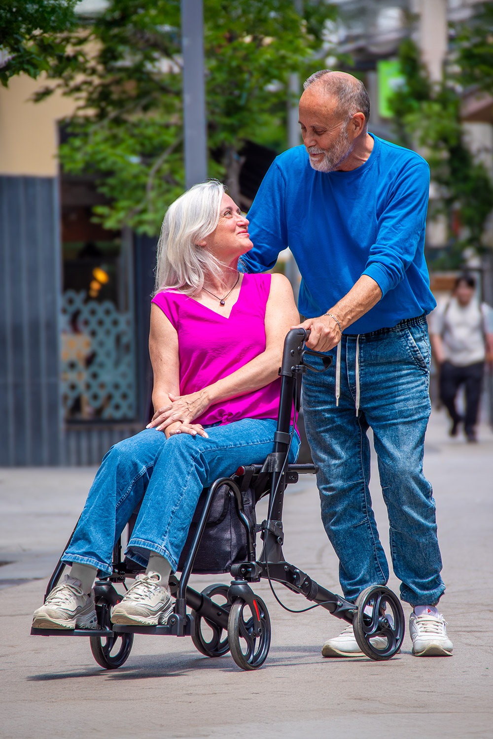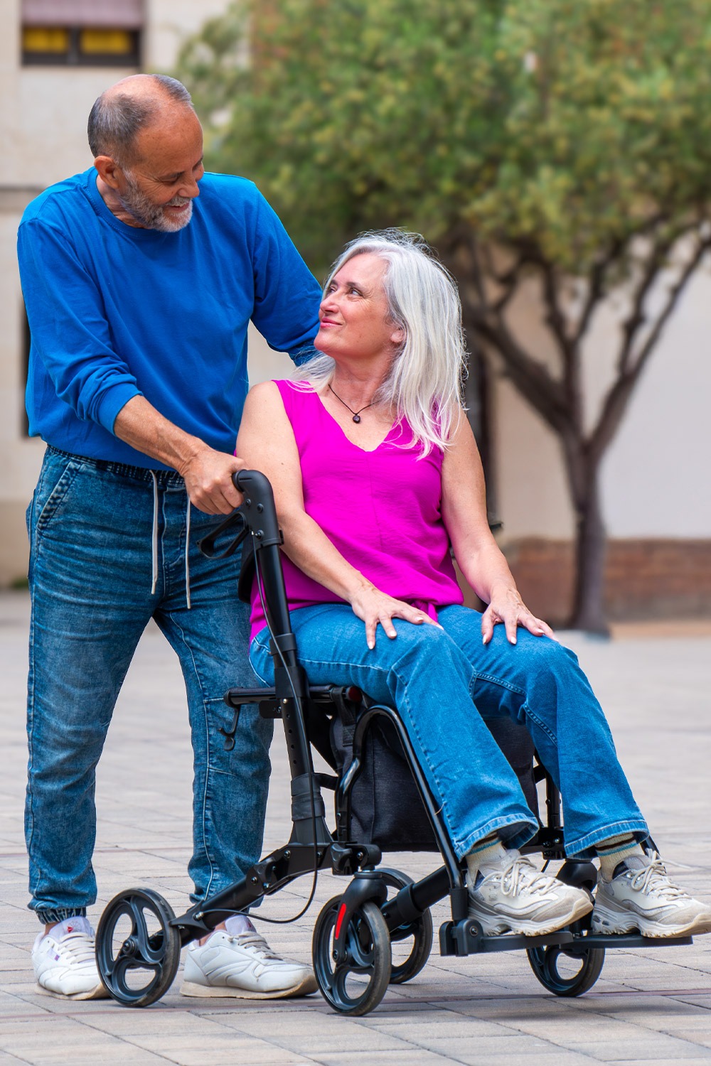 Este modelo destaca por incorporar de serie reposapiés regulables en altura, lo que permite transformarlo fácilmente en una silla de ruedas manual. Con solo abatir el respaldo y girar los reposapiés, el usuario puede sentarse de forma cómoda y segura, adaptando la posición según sus necesidades.