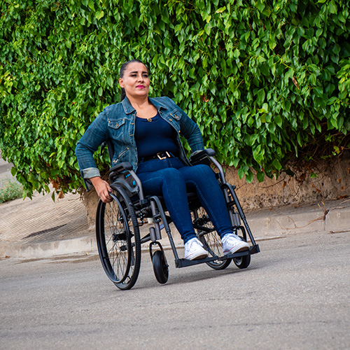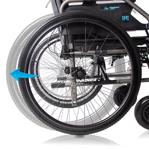 El centro de gravedad puede modificarse fácilmente mediante la platina de la rueda trasera Ø60 cm. Al desplazarla hacia atrás, la silla se vuelve más pasiva y el centro de gravedad queda más adelantado respecto al eje.