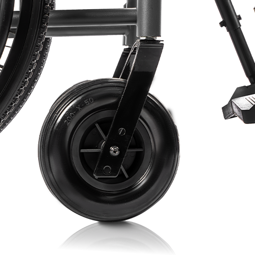 Las ruedas delanteras se caracterizan por su gran tamaño, con un diámetro de Ø200 mm y un ancho de 50 mm, ideales para terrenos irregulares. Además, las horquillas son de aluminio.