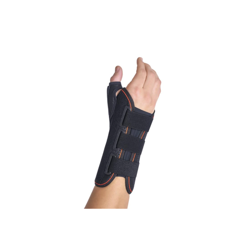 Polsband binnen gemaakt met ademende badstof met antibacteriële behandeling Thermy-tex. In de palmische zone heeft het een kneedbare en verwijderbare aluminium spalk met halfronde ondersteuning. In de zijzone heeft het een smeedbare aluminium abductorspalk om de positie van de duim te regelen. Het bevat ook twee flexibele walvissen in het dorsale gebied om te helpen bij de stabilisatiefunctie; elastische lycra, vergemakkelijkt het plaatsen en sluiten van klittenband met gespen.